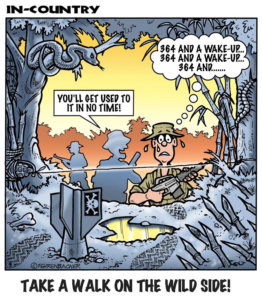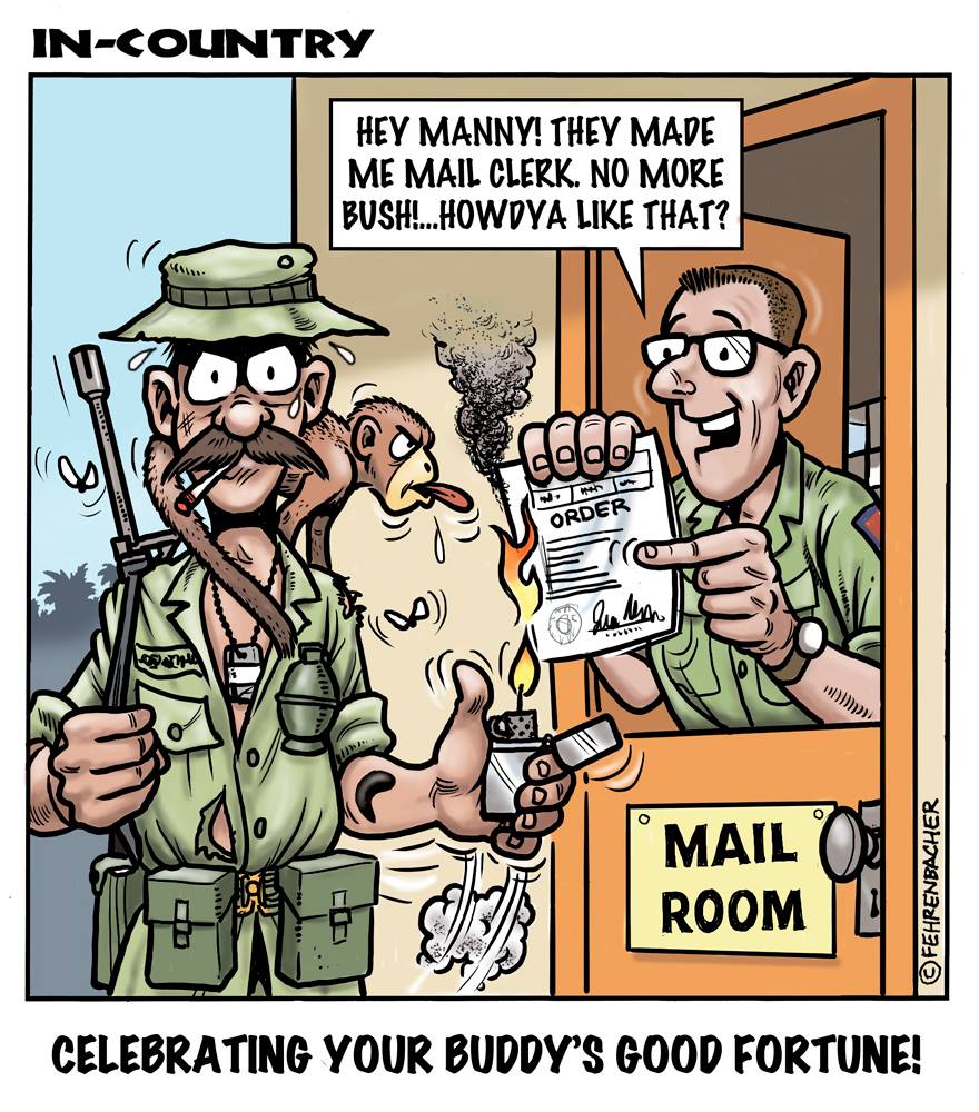 Phil enlisted in the Army in 1965 where you served for years in Vietnam.  He became a graphic designer and has worked for the state of Oregon for 26 years.  He retired in 2003 and started the Cartoon "In-Country".  The cartoons reflect his experiences during his tour of duty in South Vietnam.